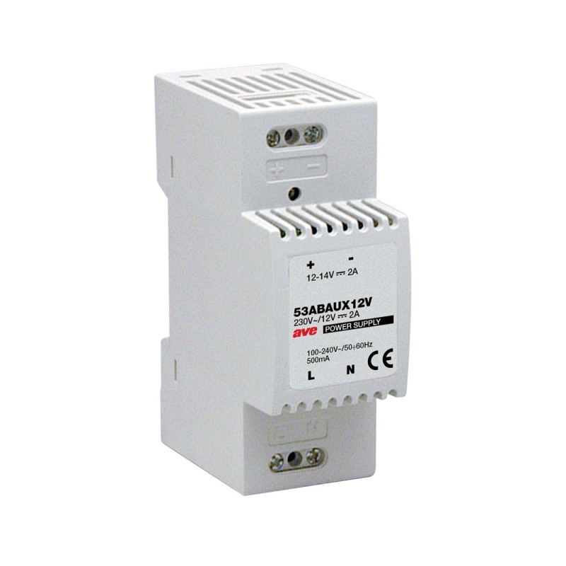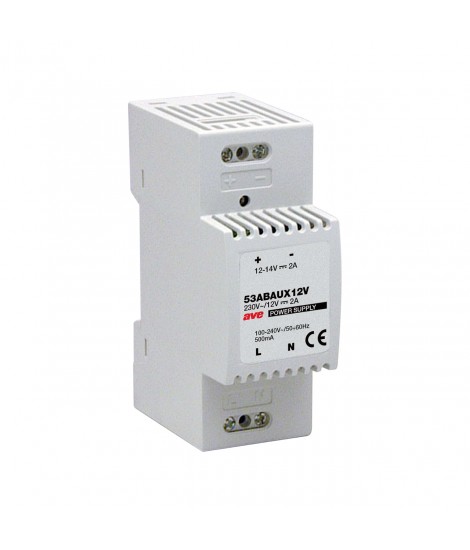 Alimentatore switching 12-14Vcc 2A per linea ausiliaria (AUX 12V) di AVEbus, per i Touch Screen DOMINA smart IoT oppure per i dispositivi della gestione alberghiera. Tensione di uscita regolabile tramite potenziometro da 12 a 14 Vcc. Corrente massima erogabile 2A - 2 moduli DIN
