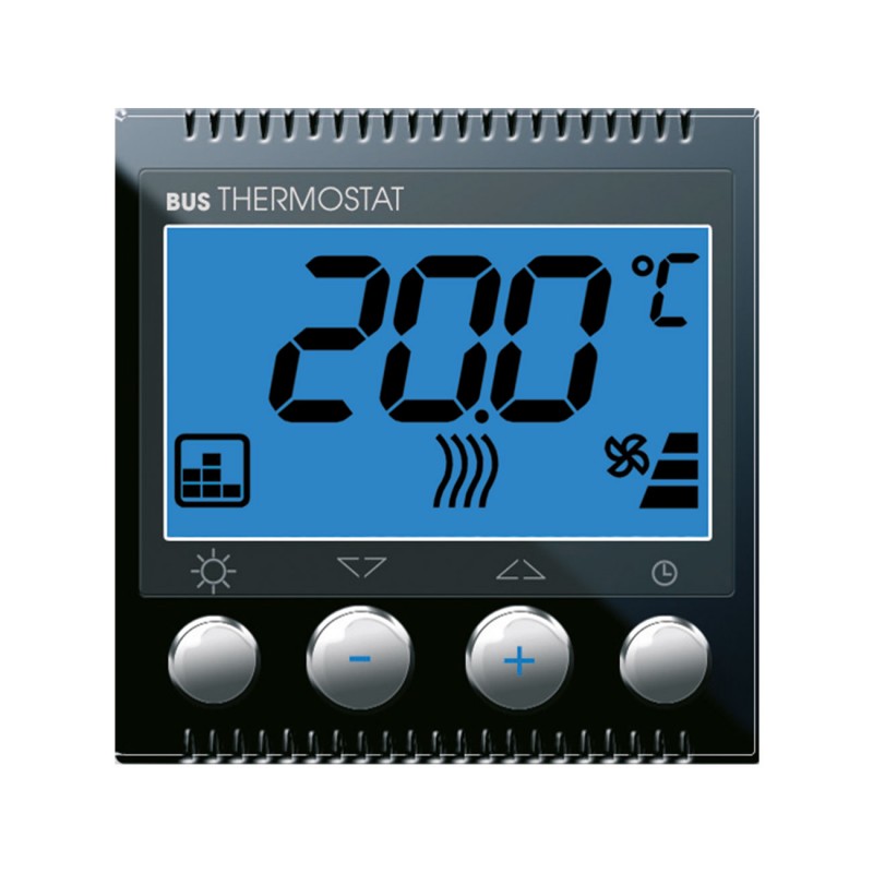 Termostato ambiente con display retroilluminabile per sistema domotico AVEbus. Il dispositivo va installato abbinato ad un attuatore termoregolazione e, quando e'necessario un profilo termico settimanale, va abbinato anche al supervisore domotico Web Server o Touch Screen al fine di gestire il funzionamento centralizzato di tipo Cronotermostato - 2 moduli S44