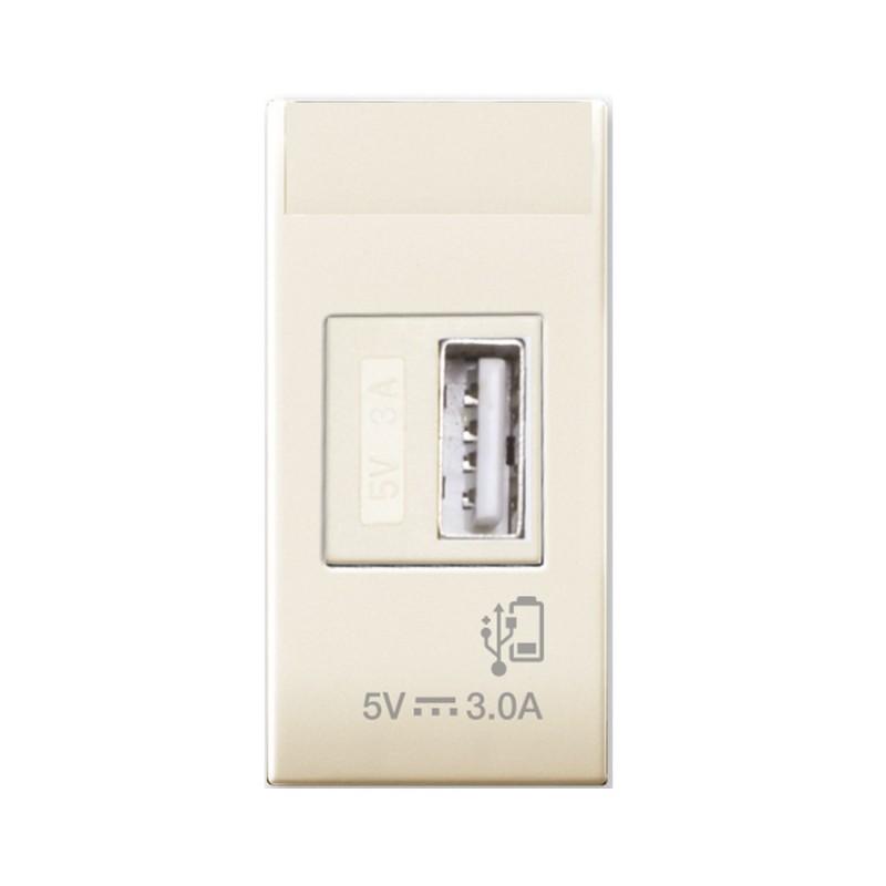 Caricatore USB universale, Serie Class colore sabbia - nr 1 uscita USB frontale - alimentazione 110-230V~ 50-60 Hz uscita 5V 3A - assorbimento a riposo < 0,1 W - consente la ricarica di telefoni cellulari, riproduttori audio portatili, consoles portatili e ogni altro apparecchio elettronico che offra la possibilita'di ricarica da una qualsiasi presa standard USB - 1 modulo