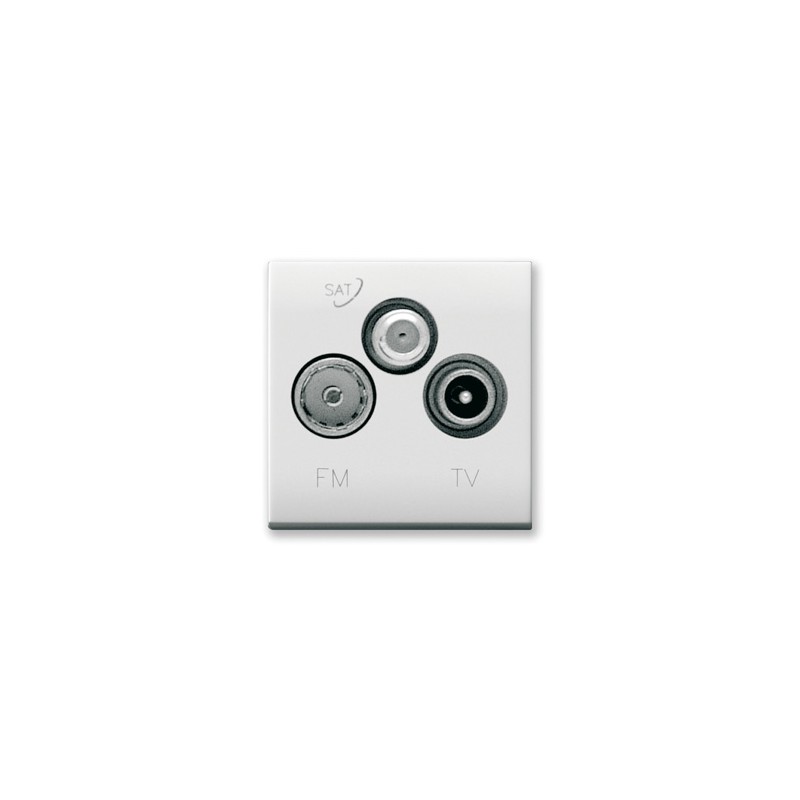 Presa TV-FM-SAT diretta demiscelata, Serie Domus colore RAL9010, 3 porte utente con connettore TV IEC 60169-2 maschio, connettore radio IEC 60169-2 femmina, connettore SAT tipo F femmina - per frequenze 4-2400 MHz - attenuazione di derivazione 1dB - permette il passaggio di corrente continua e segnali di controllo (24V 300mA max) attraverso il connettore F femmina - collegamento in ingresso mediante morsetto a vite - 2 moduli